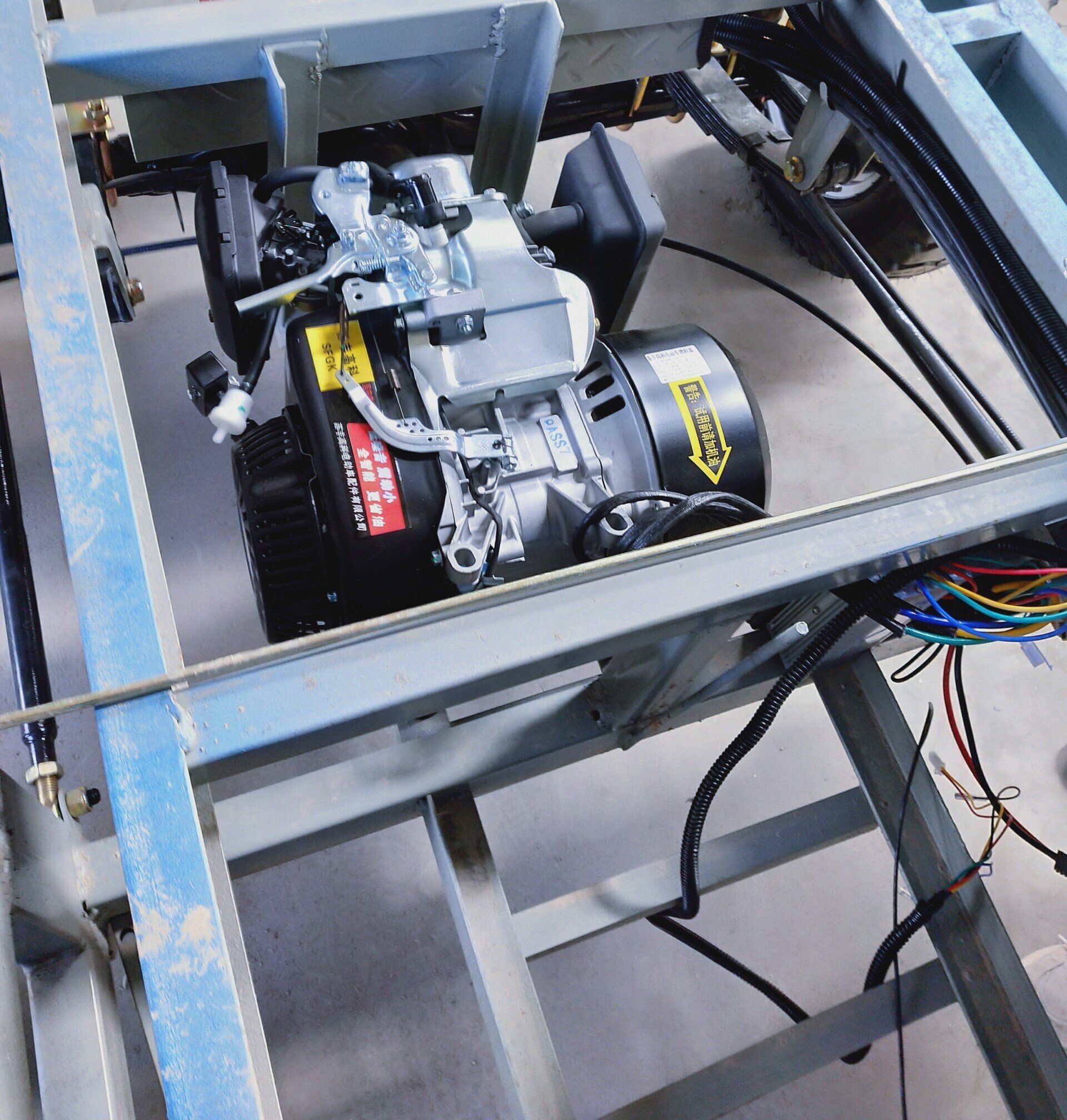 Optional ZEV Range X , Range extender serial hybrid generators to add range with heavy loads. The 5000 watt generator can be started from the cab and will charge and maintain the battery level to extend the range. The range then becomes only limited by the size of the fuel tank. But the fuel burn is extremely low with range added of about 150 km per gallon of fuel.