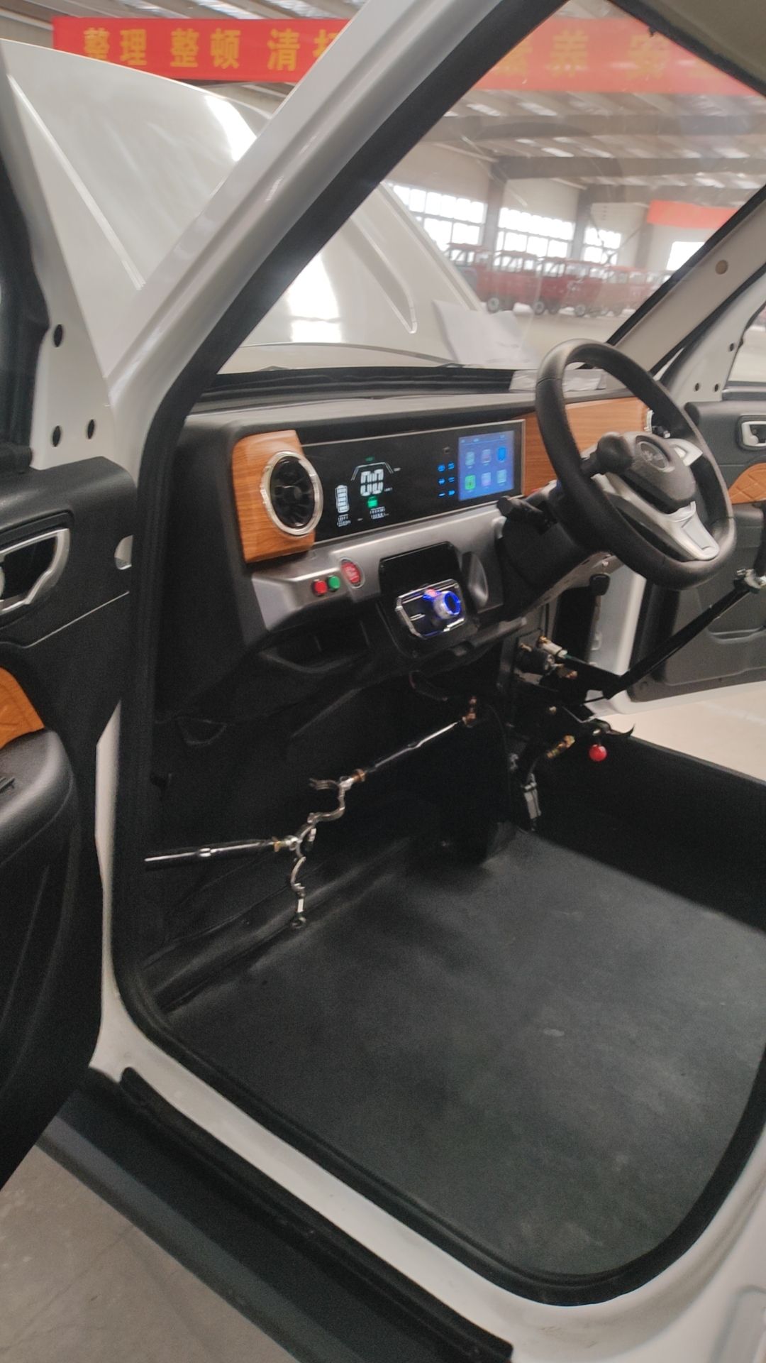 2) A center steering wheel with only the wheelchair in the front row.