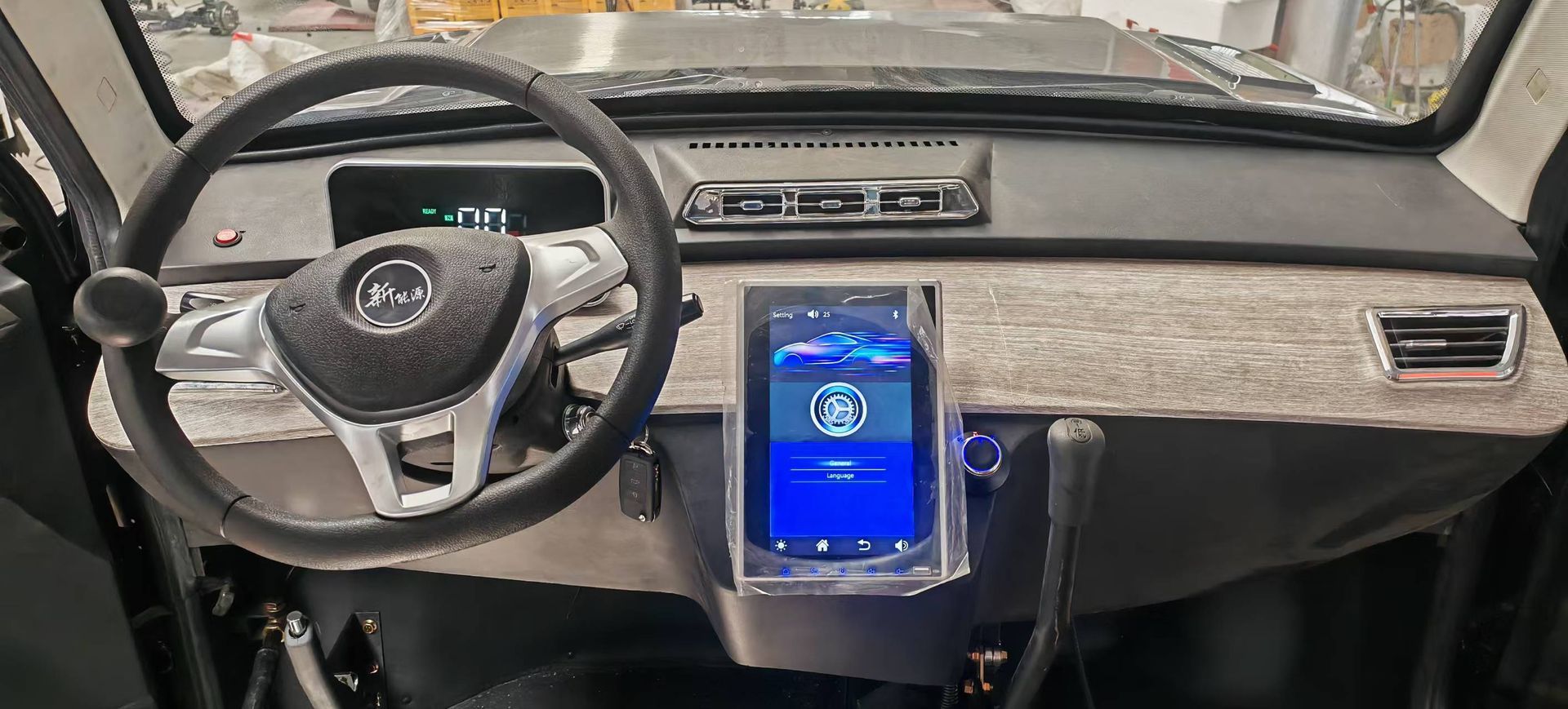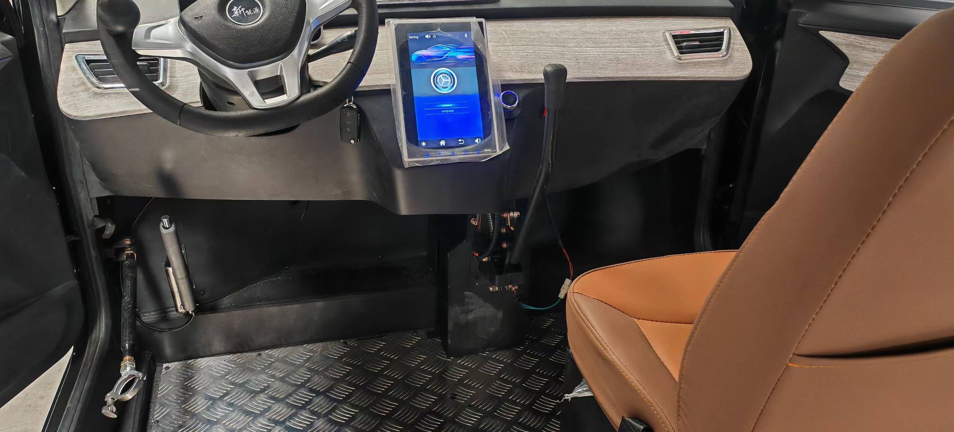 1) A left side steering wheel with a passenger seat on the right
