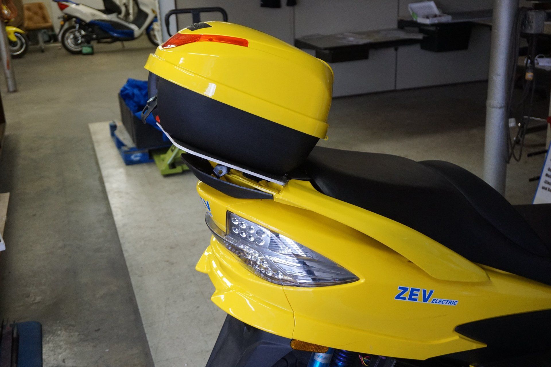All ZEV models use the same rear box (except delivery bikes). It is the largest we can source with big reflectors on the rear to increase visibility. Color matched to the bike if ordered at the same time, or black. Box size is 15 in wide and long, 11 inches deep (top of lid to box bottom)