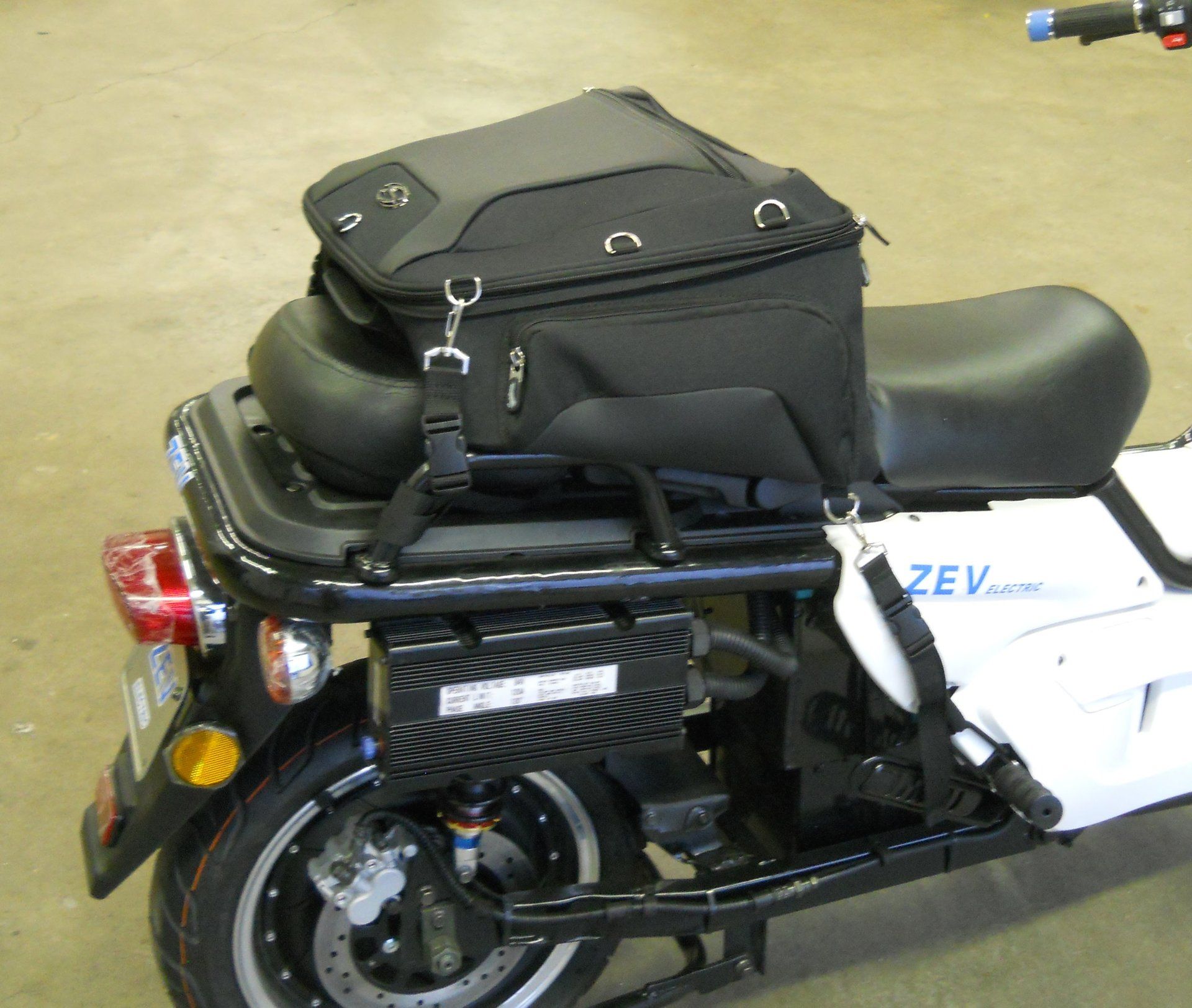 A quick snap on or off tunnel bag that fits exactly across a ZEV seat on T Series models. The alternative to bolting on a rear luggage hard box. Quickly removed or added as your loads require. The bag hugs and hangs down the side of the seat like mini saddlebags. A carrying handle for when the bag is not mounted. Five exterior pockets, 5 interior pockets. Space for a laptop (15 inches wide). Integral rain cover pulls out of a pocket and over the bag for weather protection