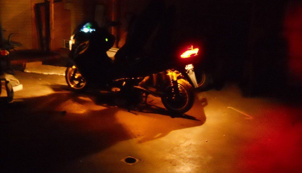 Separate on off switch. Shown below on LRC. The lights throw a puddle of yellow light around the bike, light up the front wheel, and rear wheel. 50 LEDs.