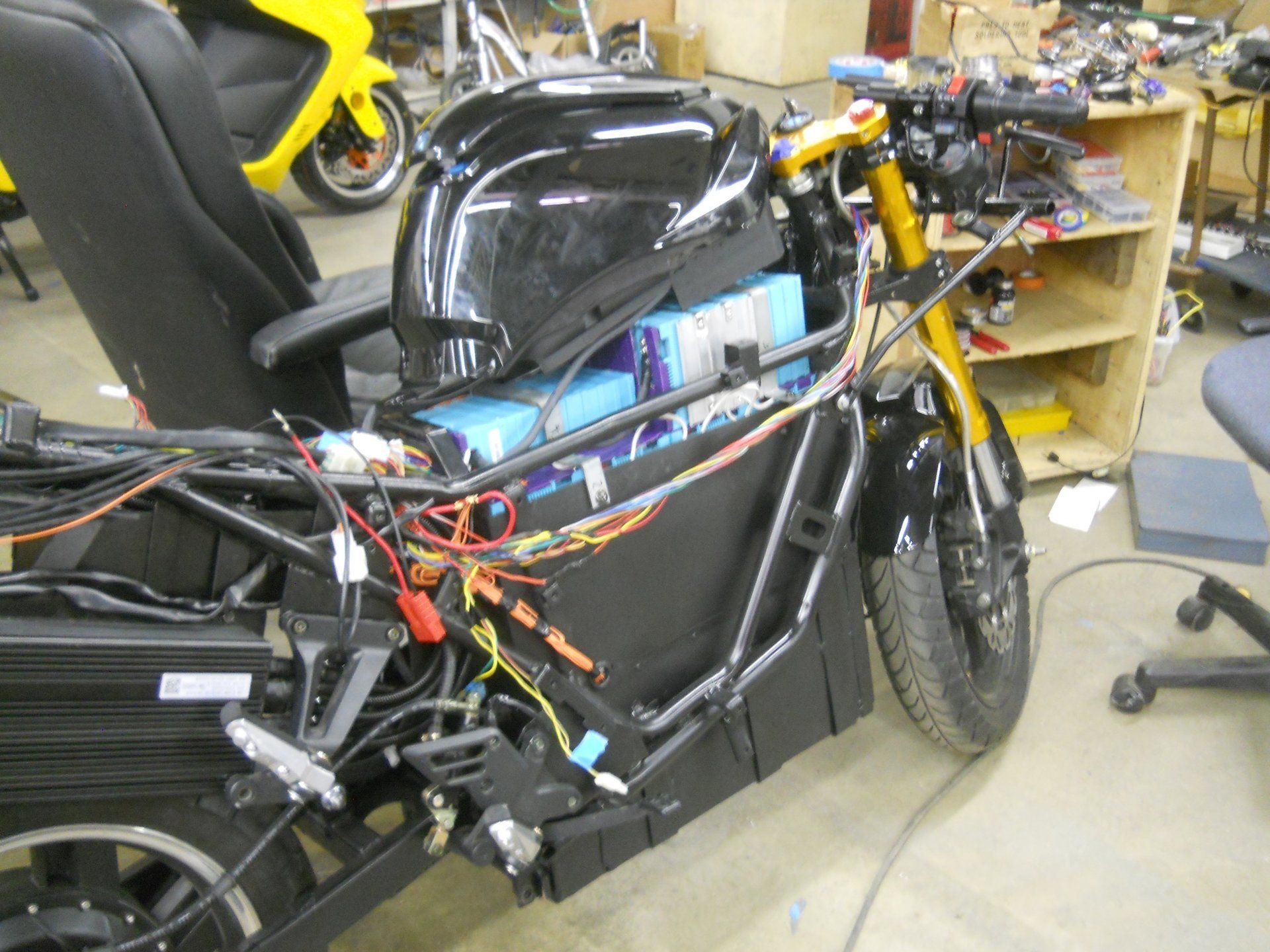 - Charger - Switch between 220 and 110 volt input. Not built into the bike. 15 amps, 1580 watts.